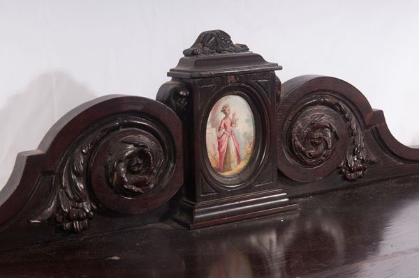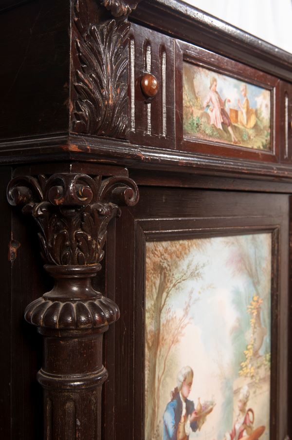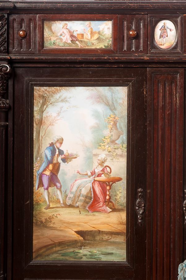 with two doors and two drawers with polychrome porcelain plaque finishes with genre scenes.