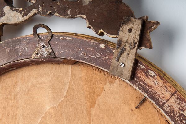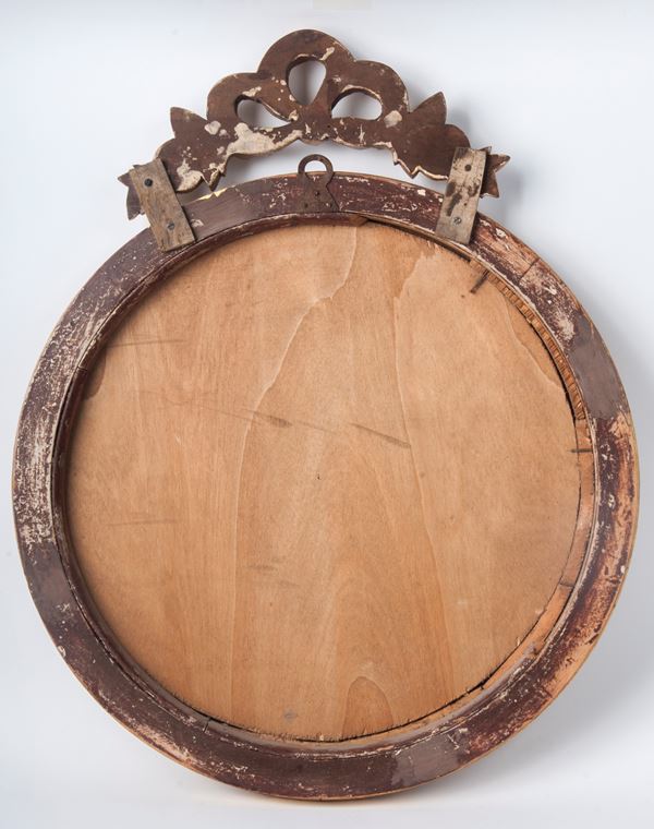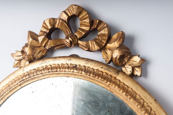 in gilded wood carved with palmette motifs along the upper edge and a bow-shaped top with flowers.