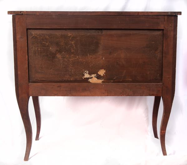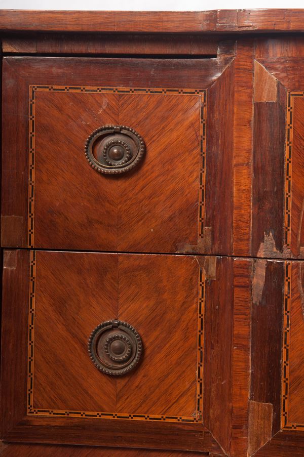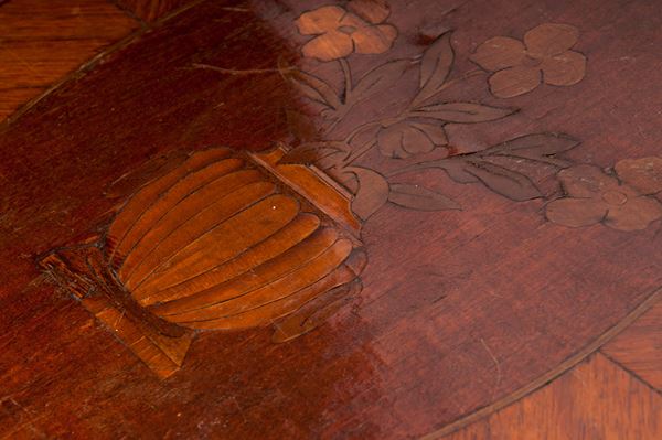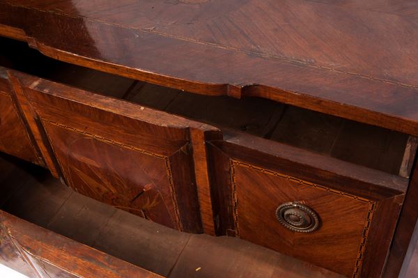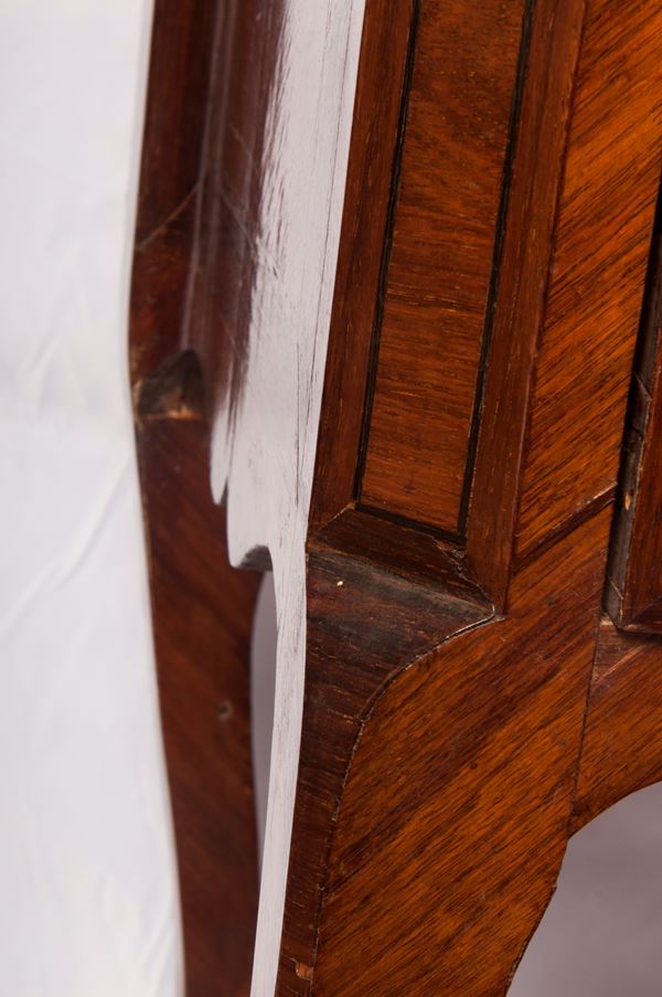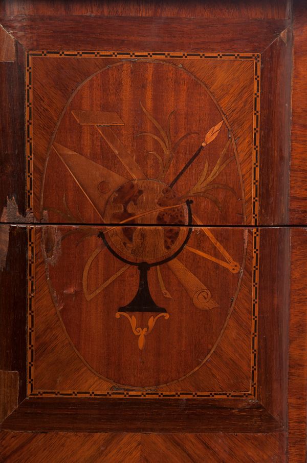rectangular in shape with a projecting front and four sabre legs. In mahogany veneered wood. Geometric fruitwood finishes and central medallion on the front with line inlaid measuring instruments.