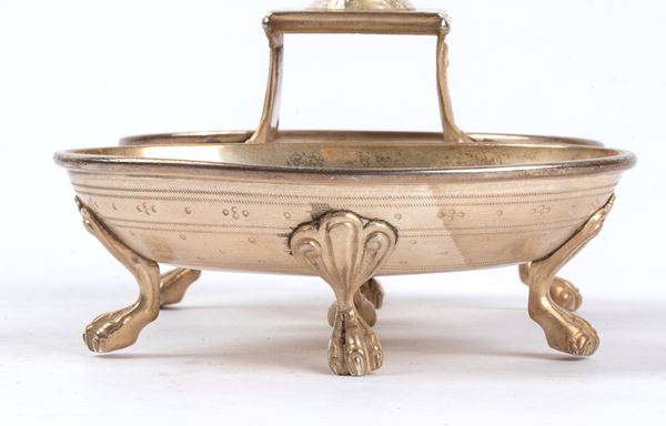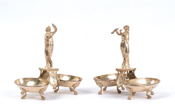 Composed of two oval basins resting on four claw feet and adorned with handles in the shape of female figures, probably Bacchantes, each holding respectively a flute and a cup and wine bottle.