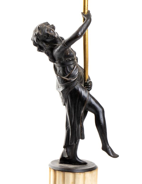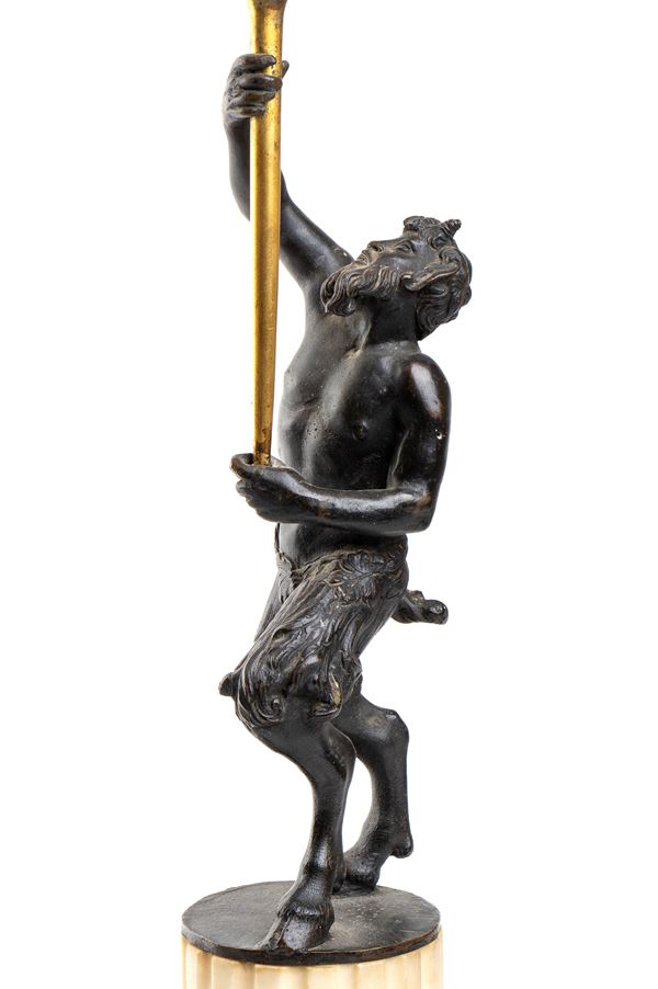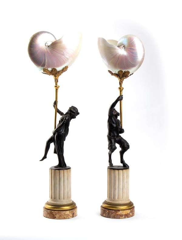 Two mythological figures in dark patinated bronze, respectively depicting a female figure and a satyr, both characterized by dynamic poses and well-defined, sculpted musculature. Each figure holds with both hands a gilt torch, atop which is mounted a large Nautilus shell (Turbo marmoratus), adorned at the base with gilt bronze acanthus leaves, typical of the Neoclassical decorative vocabulary. The sculptures rest on bases composed of fluted Corinthian-style columns made of marble, with gilt elements and circular marble plinths.