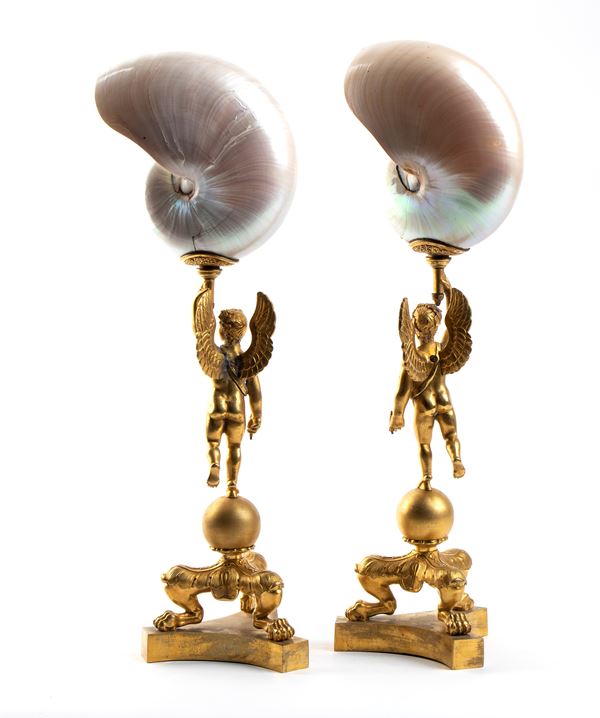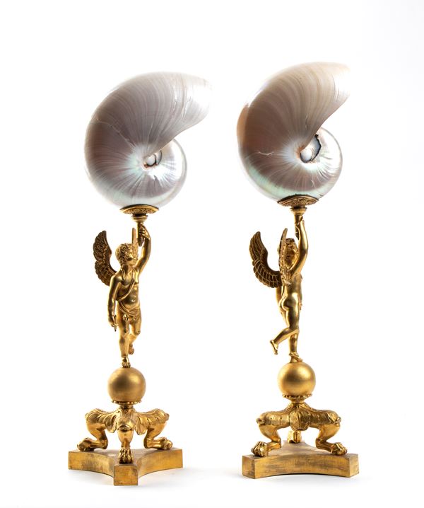 A pair of nautilus shells mounted on bronze bases, late 19th century
