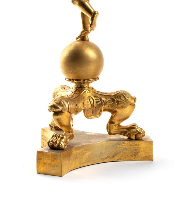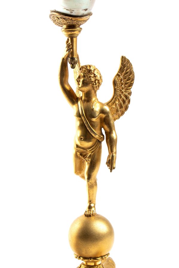 Geometric base in gilt metal, supported by three elegant leonine legs finely adorned with phytomorphic motifs and culminating in a smooth sphere. From this sphere rises the figure of a winged putto, arms spread, lifting with his right hand the base of a torch โ a clear reference to the classical iconography of Nike, the personification of Victory. Instead of flames, however, a large Turbo marmoratus shell is set in place, creating a dialogue between Neoclassicism and the aesthetic of the cabinet of curiosities.
