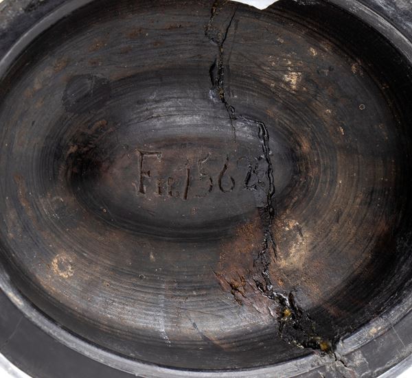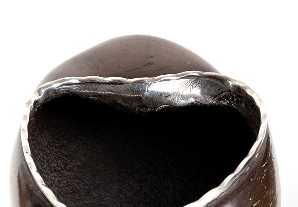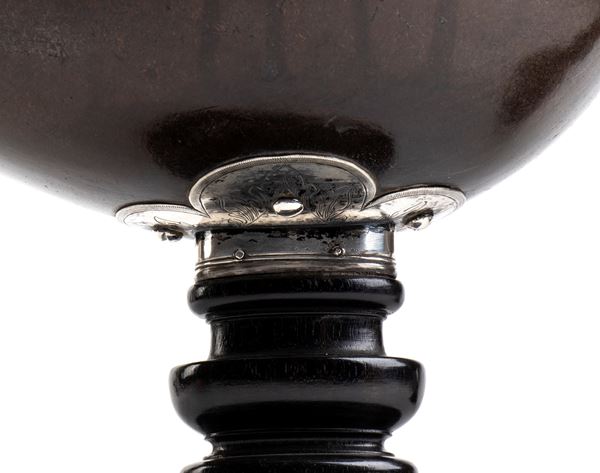 composed of one half of a sea coconut (Lodoicea maldivica), known as coco de mer, smoothed and polished, mounted on an elegant turned base, probably of ebonized wood, and silver. The mount includes decorative details in chased silver, and under the base is the date โ1562โ. Naturally originating from the Seychelles, these rare fruits were coveted collectors' items in Europe as early as the 16th century, often considered miraculous or aphrodisiac. The mounts, of European manufacture, are probably Italian or French, made in aristocratic or ecclesiastical circles for display in Renaissance Wunderkammern or studioli.