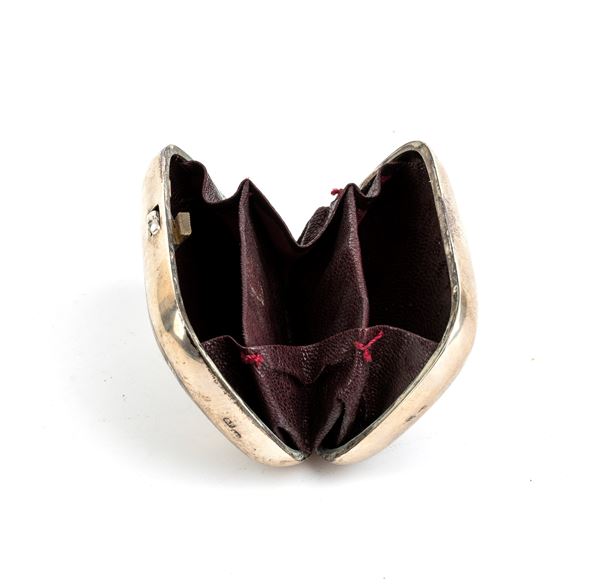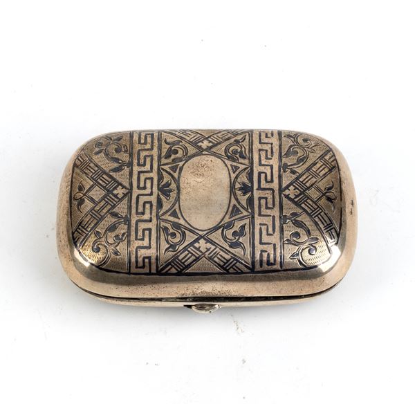 oval in shape with hinged lid, entirely niello-worked with stylised floral and geometric motifs and featuring burgundy leather interiors.