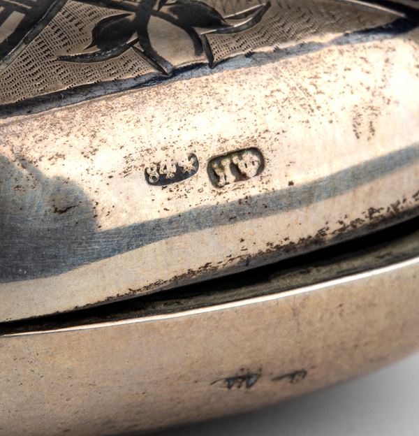 Hallmarked with the multi-funcional hallmark for silver at a fineness of 84 zolotniks (875/1000) used in St. Petersburg around 1880โ1890, and bearing the mark of an unidentified silversmith.