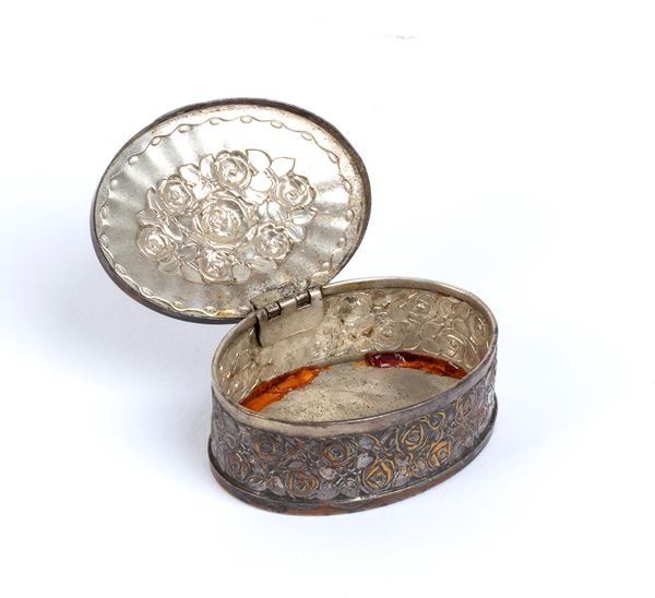 oval in shape, with hinged lid. The entire body is embossed and chiselled with leaf and rose motifs.