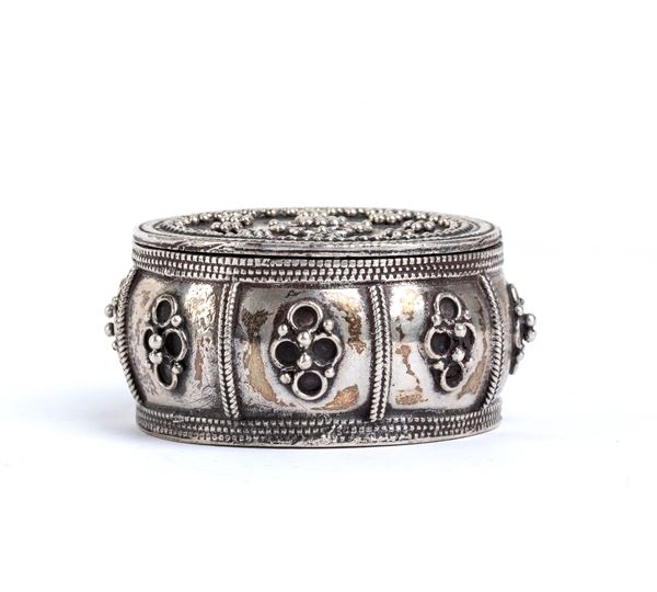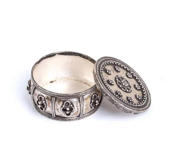 round in shape with a push-on lid. The body is decorated with delicate relief motifs, executed with fine punctuation composing stylised flowers.