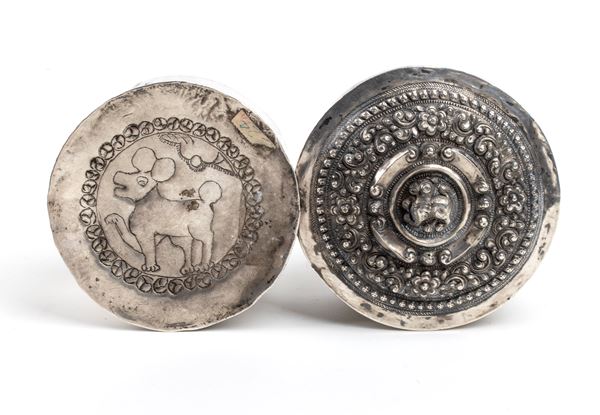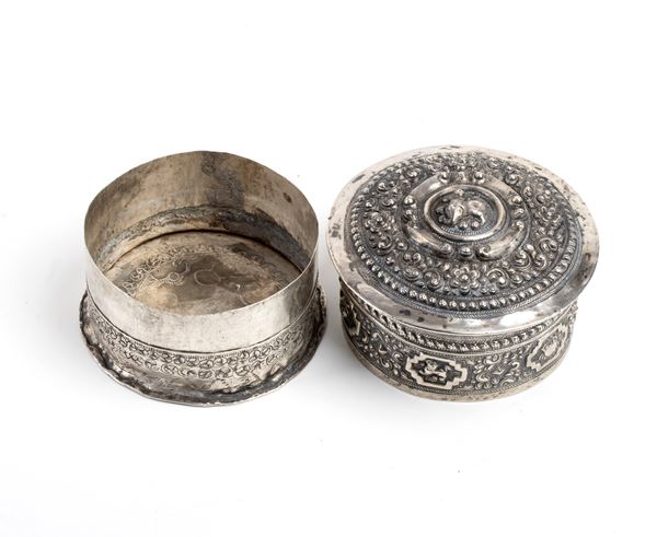 circular in shape, the richly embossed and chiselled body depicts traditional scenes from Burmese mythology and is finished with numerous decorations.