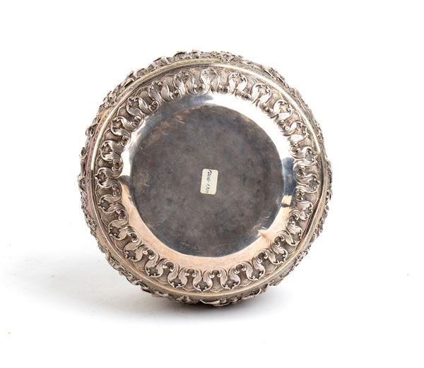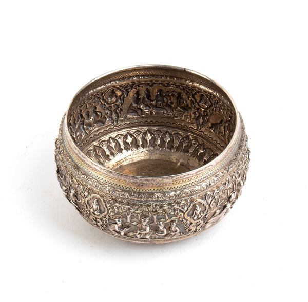 circular in shape, the richly embossed and chiselled body depicts traditional scenes from Burmese mythology and is finished with numerous decorations.
