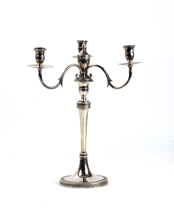 circular foot with palmette decoration, smooth shaft on which the three-armed upper part is grafted with three side flames and a central one.