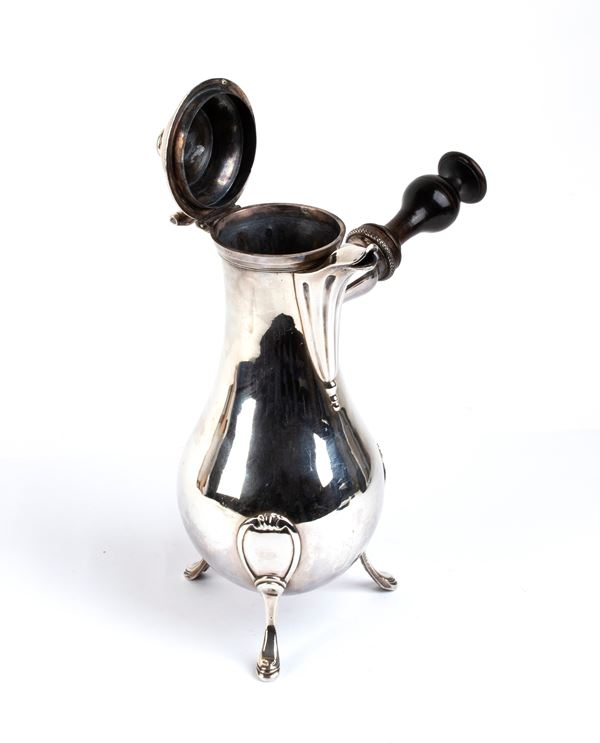 of pyriform shape with smooth body, resting on three stylised feet, hinged lid and radial turned wooden handle.