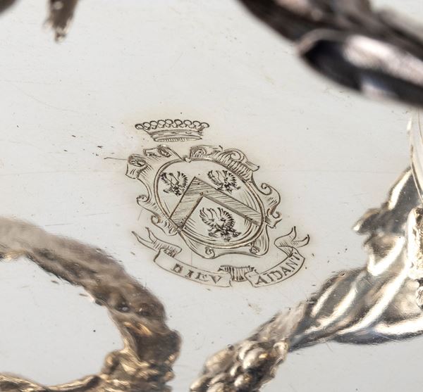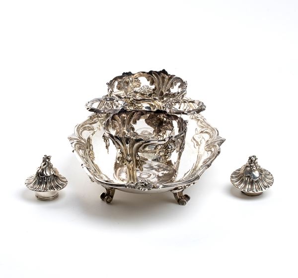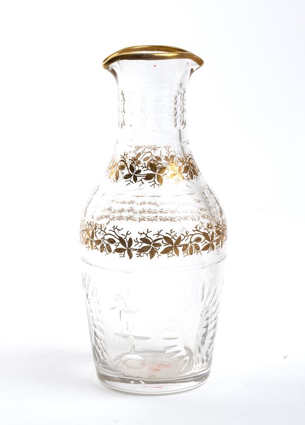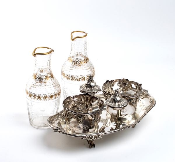 Oval in shape, resting on four small feet decorated with vegetal motifs and grape clusters, which are also repeated along the edges and on the bottle holders. The recurring vine motif, gilded, also appears on the two cut glass bottles with gold applications. The cruets are fitted with two stoppers featuring vine-shaped handles.