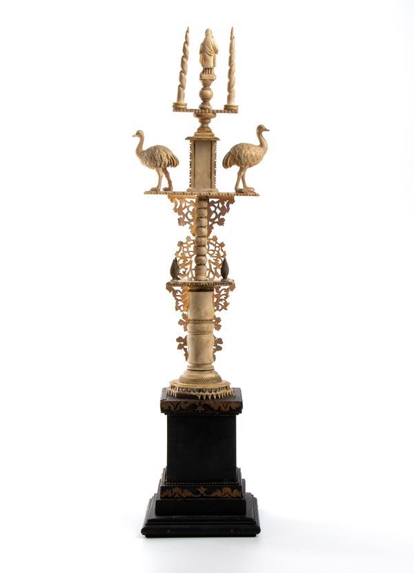 In carved and turned bone, resting on an ebonized wooden base decorated with floral motifs, it features an elaborate design with intricate decorative elements and a multi-level structure. The piece is likely a liturgical or decorative object from the Baroque or Rococo period, crafted with exceptional artisanal skill.