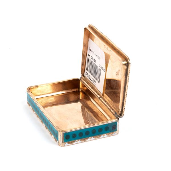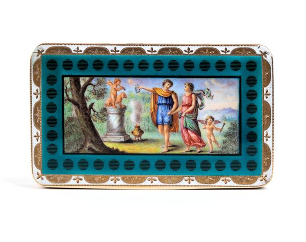 Made of 12k yellow gold, rectangular in shape, decorated with perimeter frames in white enamel alternating with enamelled bands in shades of blue: the lid is polychromatically enamelled with a mythological scene with figures and musician putti.