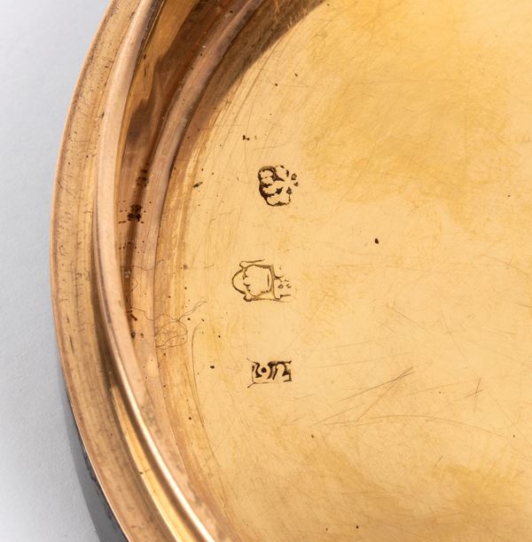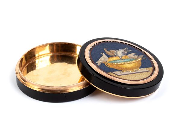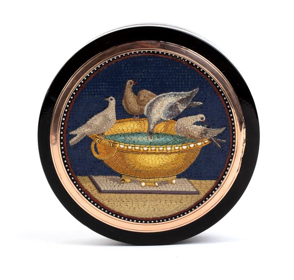 of round shape, made of tortoiseshell (hawksbill sea turtle, Eretmochelys imbricata, Cheloniidae) with yellow gold inner and outer details; the lid with a Roman micromosaic depicting Pliny's Doves, a compositional scheme often used by the famous Roman mosaicist Giacomo Raffaelli and other mosaicists. This depiction shows four doves on the rim of a gilded bronze cantarus filled with water, from which one of them drinks.