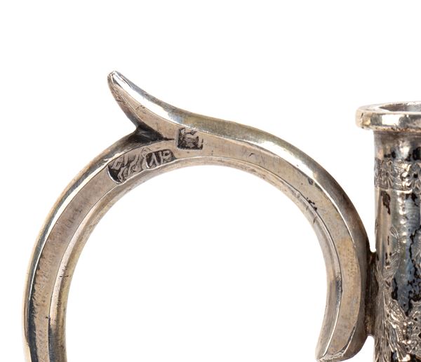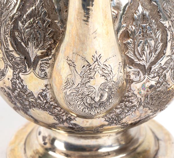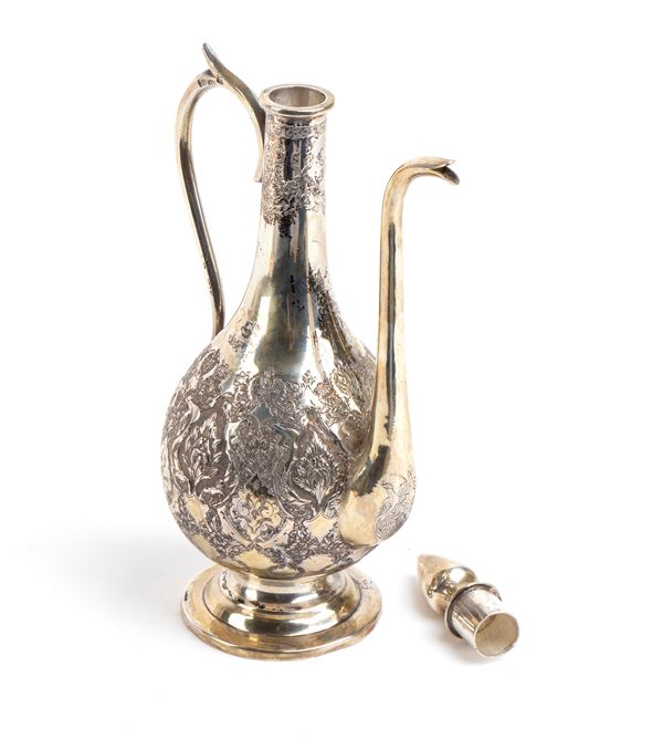 the surface finely decorated with engravings depicting floral motifs and elegant arabesques. Resting on a circular base, it has a small grafted lid, the pourer is elongated and gradually tapered, while the slender handle creates a scroll motif.