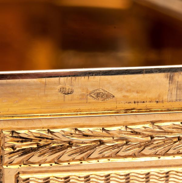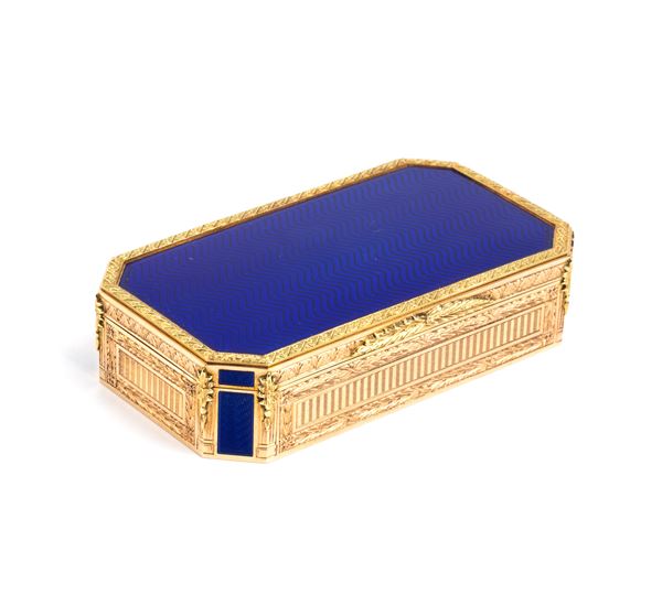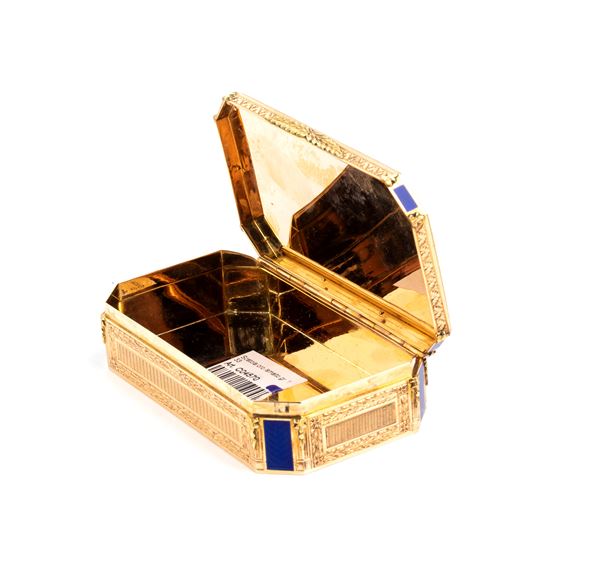18k yellow gold, rectangular in shape with chamfered corners, finely decorated with guilloché and vegetal elements over the entire surface, the lid and the four corners in guilloche enamels in shades of blue.