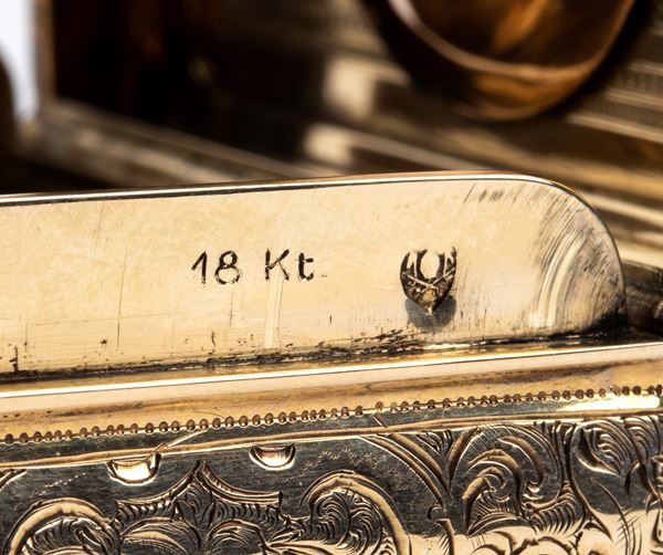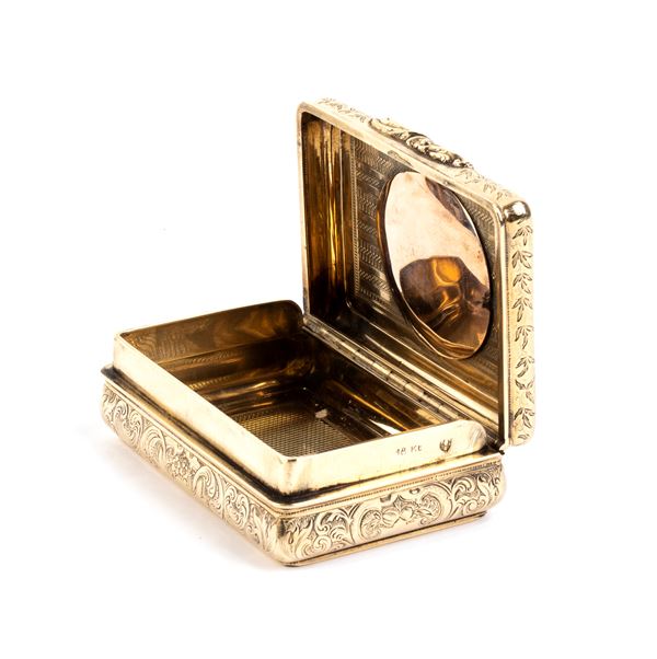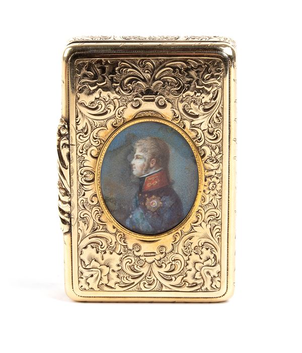 of rectangular shape in 18k yellow gold, decorated with geometric motifs on the bottom and inside, the lid and sides with floral decorations. In the centre of the lid is a polychrome enamel miniature depicting an officer in half-length profile.
