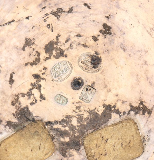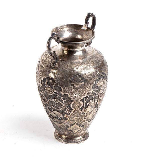 in the shape of an amphora, characterised by a circular base and a rounded body in the centre, tapering upwards to end in a narrow neck and a small flared rim. The entire surface is finely worked by embossing and chiselling, with a rich decorative apparatus composed of interwoven arabesques framing a series of shaped panels with animated scenes depicting animals and moments of everyday life.