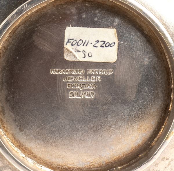round, with two side handles, embossed and chiselled with figures from Indian mythology and stylised engraved floral elements.