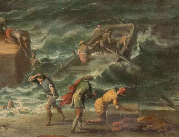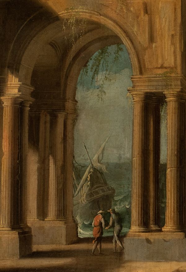 Coastal capriccio with stormy marina, building with portico, boats and figures