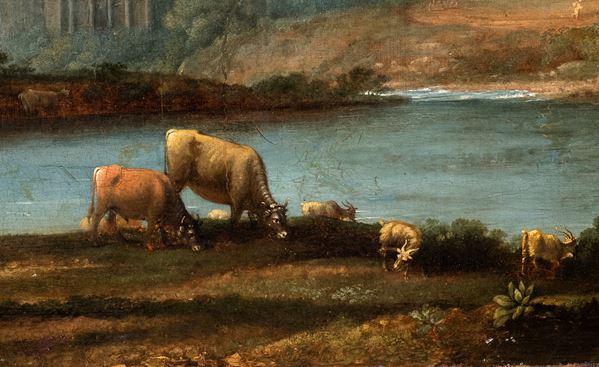 Landscape with shepherds and grazing flocks, pool of water and Colosseum in the background