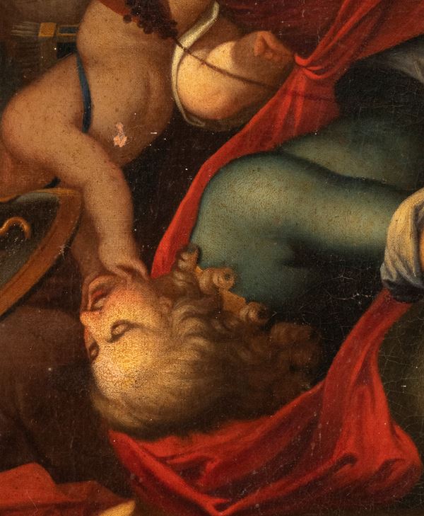 This painting, with its highly unusual iconography, is closely based on an idea by Otto van Veen, translated into print by Pieter Perret. The allegorical composition places the shepherd Syphilus at the center, surrendered to bodily pleasures and intoxication—an emblem of vulnerable mankind—besieged by the personifications of Venus (carnal love), Bacchus (intoxication), Ceres (gluttony), Poverty, Death, and Time. On the left, an armed Minerva attempts to pull Syphilus away, flanked by putti descending from the heavens bearing a laurel wreath and a palm—traditional rewards of virtue. The classical temple in the background, identified as Apollo’s, may also allude to the soul’s ascent toward knowledge and inner balance. The painting visualizes the moral and philosophical content of Syphilis sive de morbo gallico (1530), the Latin poem by Girolamo Fracastoro, a Veronese physician and poet. In the poem, Syphilus is a young shepherd who refuses to venerate Apollo, and is punished by the god with a new and terrible disease, marked by ulcerations and bodily deformities. The poem is not only a literary work but also a medical treatise on a newly emerging illness, described with great precision, to which the author gave the name “syphilis,” deriving it from the name of the protagonist.