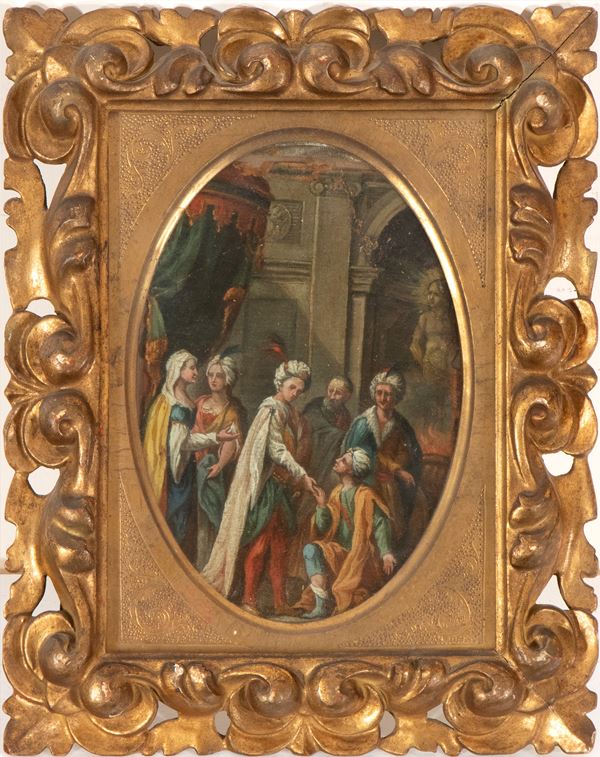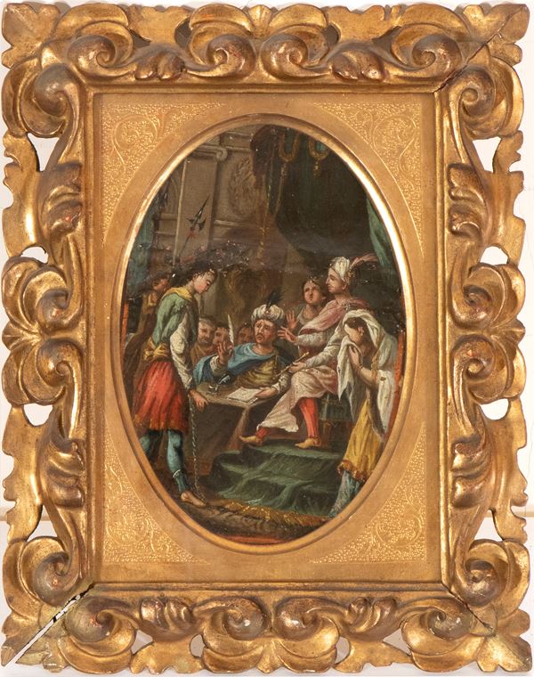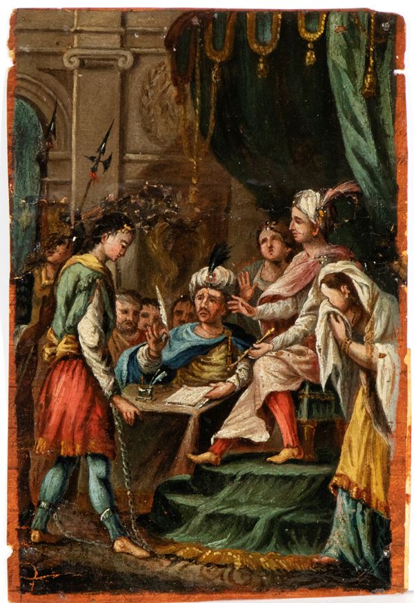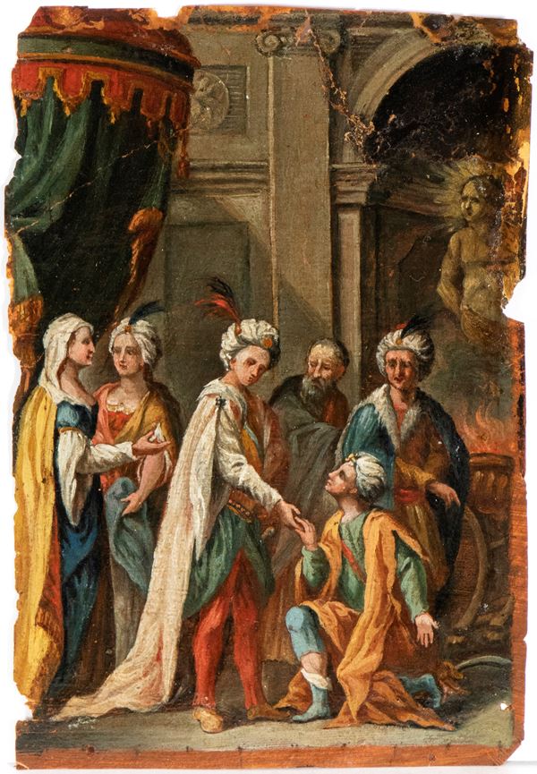 a) Judgment scene with prisoner; b) Thanksgiving scene with genuflection. Pair of paintings