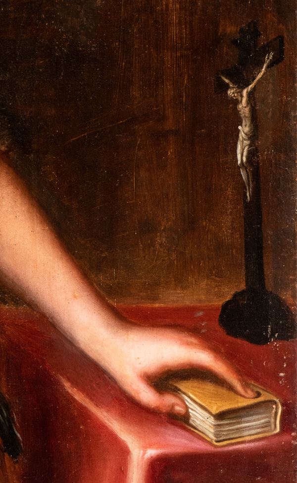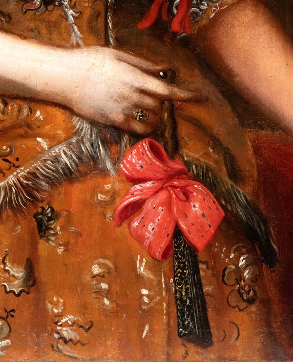 Portrait of a lady with elaborate hairstyle, fan and missal