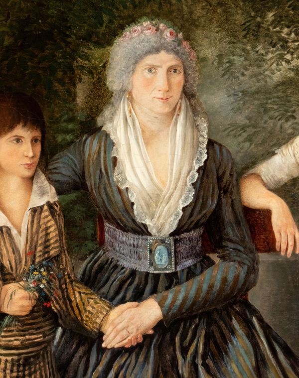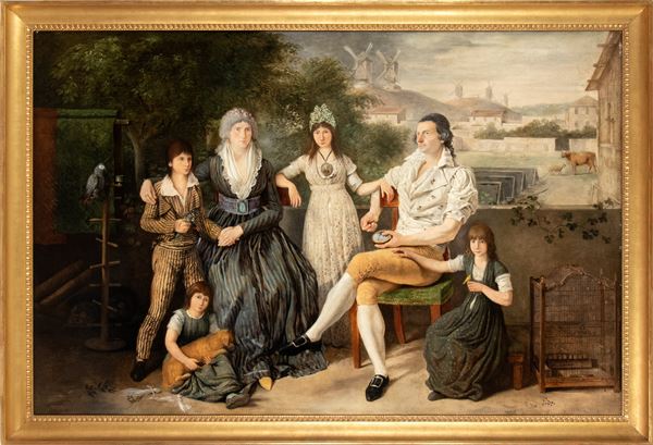 Family portrait in a garden with Dutch town and windmills in the backgrounds