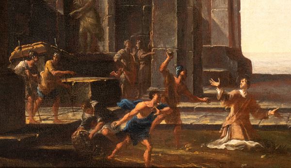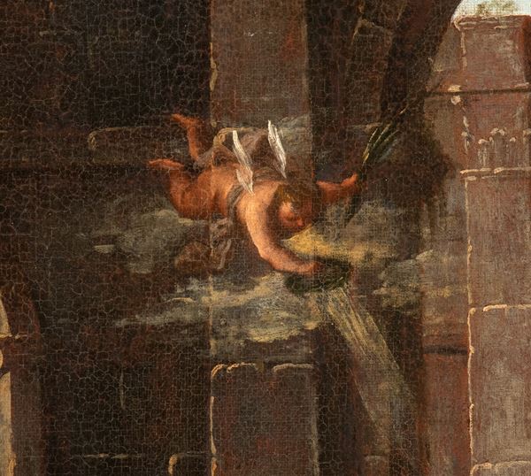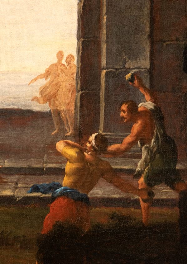 In this beautiful capriccio, the typically codazzian architectural setting is accompanied by the episode of the Martyrdom of St. Stephen, which refers to one of his Roman figure specialists.