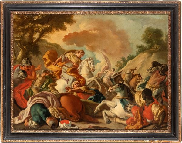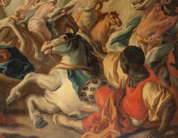 L'opera ben s'inquadra nella matura produzione di Francesco De Mura, quando l'acceso solimenismo che caratterizza la sua produzione giovanile è venuto declinando in favore di una maggiore luminosità di toni e leggerezza di pennellata, conferendo alle sue composizioni una raffinata teatralità. Il termine di paragone più stringente per la nostra composizione è il dipinto di De Mura raffigurante Giosuè ferma il sole nella battaglia contro i gabaoniti, in collezione privata napoletana, in cui le figure ai due angoli del primo piano e il cavallo bianco al centro della scena appaiono quasi sovrapponibili a quelle della nostra tela (vedi N. Spinosa, Pittura napoletana del Settecento. Dal Barocco al Rococò, Napoli 1999, n. 271, pp. 165 e 355, fig. 328).