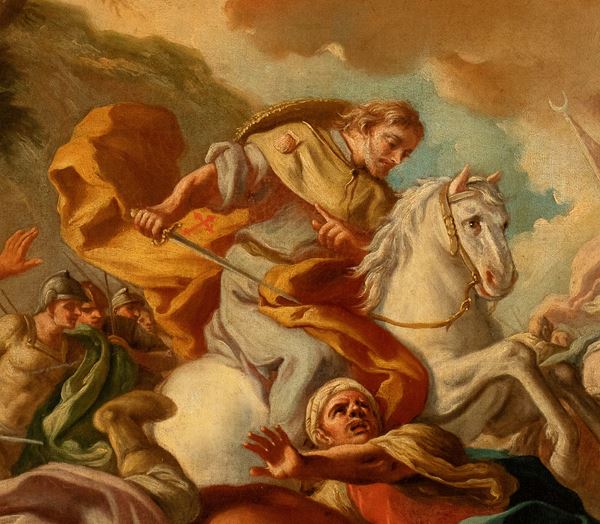 Secondo la tradizione, il 23 maggio 844 si svolse la battaglia di Clavijo, nella quale l'esercito spagnolo guidato da Ramiro di Castiglia, ormai prossimo alla disfatta, riuscì a sconfiggere le truppe saracene grazie all'intervento miracoloso di San Giacomo Maggiore (Santiago), che in sella a un cavallo bianco si pose alla testa delle truppe spagnole. Da questa leggenda prese avvio l'iconografia di San Giacomo "Matamoros" (ammazza mori), strenuo difensore della cristianità. Il bel dipinto qui in oggetto rappresenta efficacemente il momento in cui il santo semina terrore e morte nell'esercito avverso conducendo fieramente alla vittoria gli spagnoli.