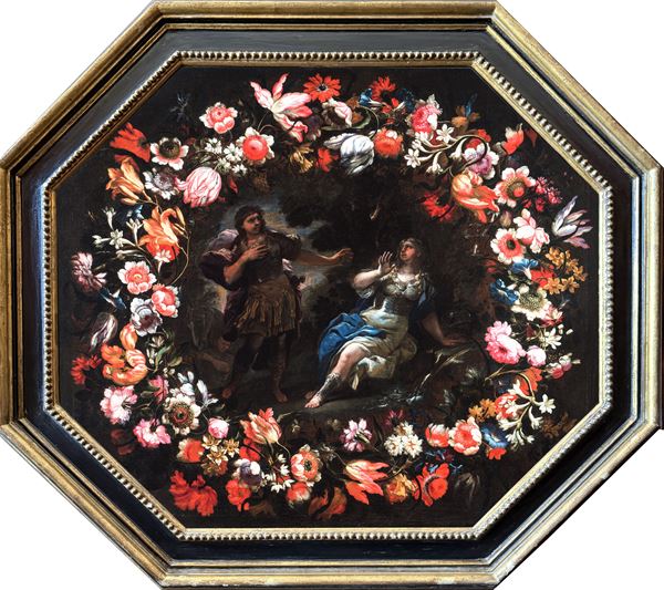 a) Garland of flowers with idyll between Rinaldo and Armida; b) Garland of flowers with Rinaldo abandoning Armida. Pair of paintings
