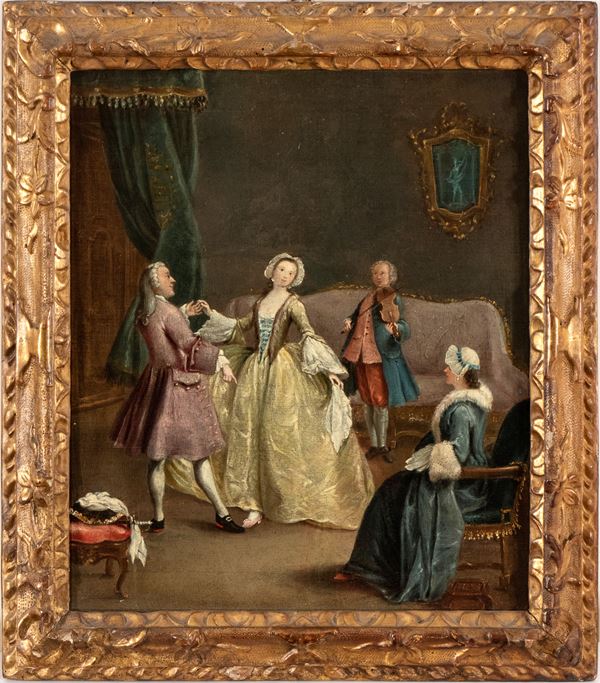 The painting replicates Jean Jacques Flipart's (1719 - 1782) engraving from Pietro Longhi's work, now in the Gallerie dell'Accademia in Venice.