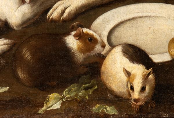 La sigla Maestro degli armenti, come quelle alternativamente adottate di Pseudo-Salini, Maestro di Baranello e da ultimo Maestro del Bacco, è il frutto della necessaria scomposizione del vasto e confusissimo corpus che fino a pochi decenni fa era radunato sotto il nome di Tommaso Salini. Caratteristica costante delle opere reclutate all'interno di questo nome fittizio, che quasi certamente dovrà in futuro essere ulteriormente scomposto in più personalità distinte, è la presenza, accanto alla figura principale (per lo più figure singole di giovani pastori o contadini), di animali domestici e da cortile. Questi ultimi, peraltro, potrebbero talora non essere della stessa mano, tant'è che in alcuni esemplari si è ritenuto di riconoscere l'intervento di Jacob van der Kerckhoven, noto anche come Giacomo Castello (1636-1712 c.), consentendo così di spostare alla seconda metà del Seicento l'attività dello stesso Maestro degli Armenti. In ogni modo nelle opere a lui assegnate è evidente la presenza di elementi romani post-caravaggeschi (Salini e Spadarino) ma anche napoletani (Sellitto). Il nostro dipinto si lega ad altri numeri riferiti al Maestro degli Armenti come il Pastore musico e animali, il Pastore con cani e fiasche e la Donna con pollame, tutti in collezione privata. Meritano di essere specificamente segnalate nella nostra tela la qualità omogeneamente alta della riproduzione degli animali, fra i quali sono ricorrenti il gatto e la scimmietta, il bel volto ancora latamente caravaggesco del ragazzo, nonché il profondo paesaggio sul lato sinistro, col lungo corso d'acqua che si perde sulla linea dell'orizzonte.