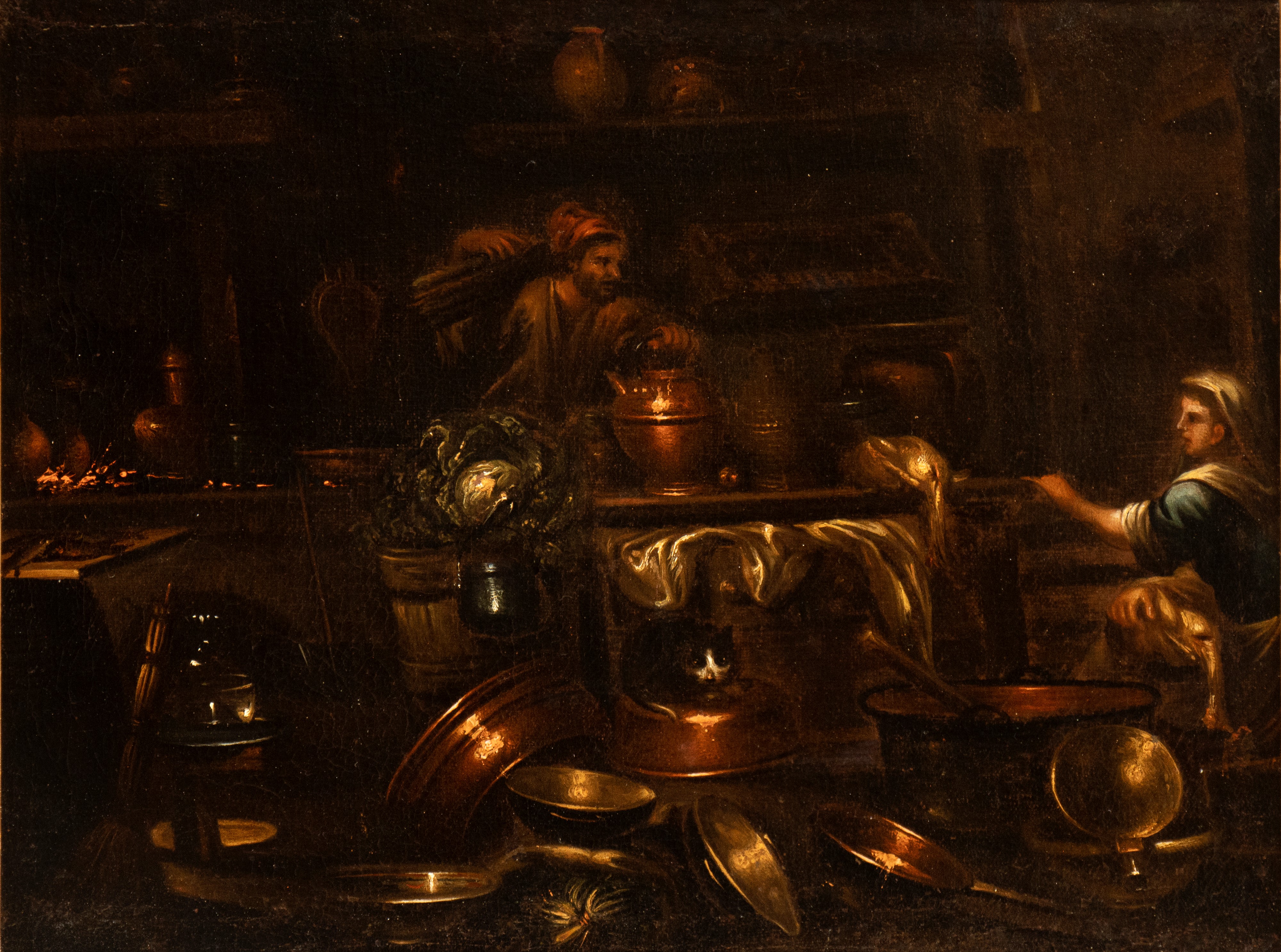 a) Kitchen with two cooks, vegetables and copper pots; b) Kitchen with pair of figures, cat and copper pots. Pair of paintings