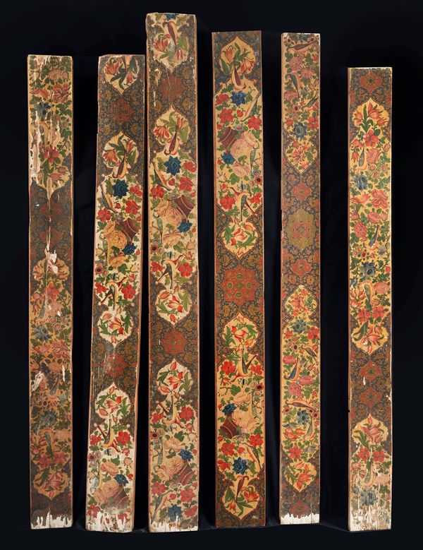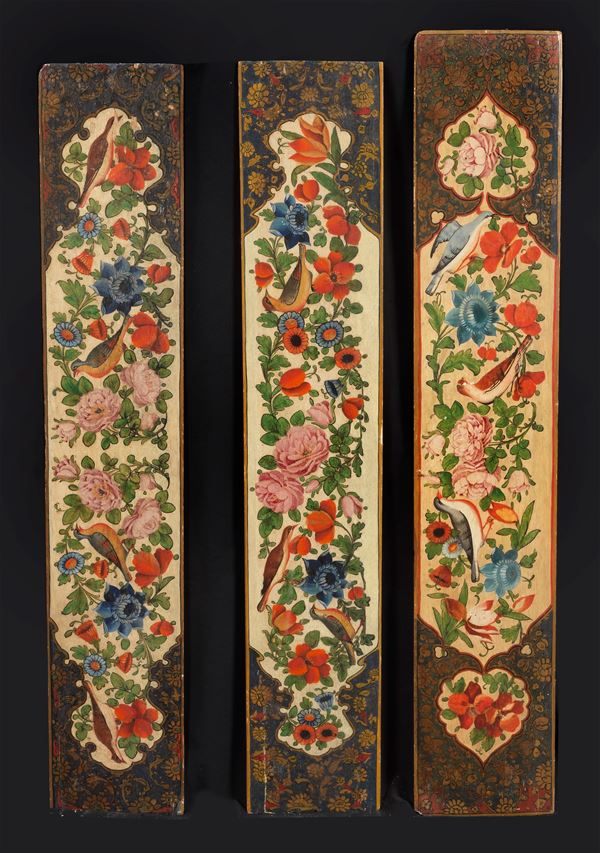 probably part of a wall ornamentation, wooden support painted in polychrome on a dark background with floral motifs, leaves, birds and racemes.