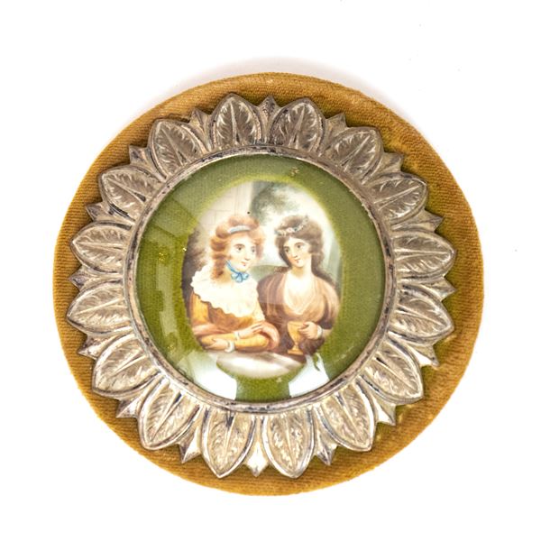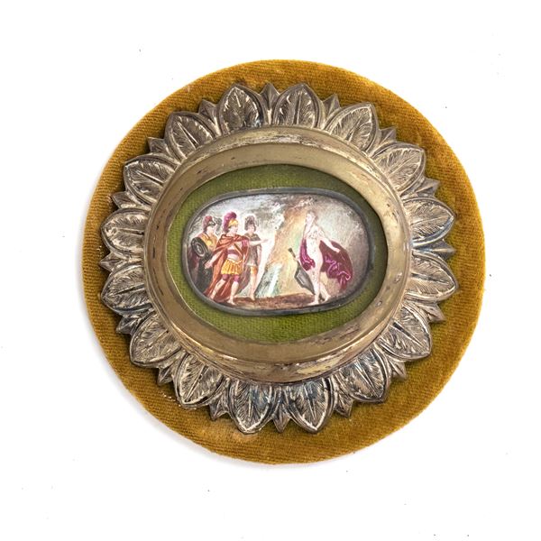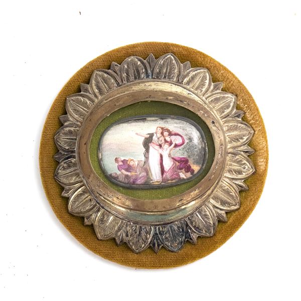 depicting mythological scenes and maidens, hand-painted, within a silver frame with plant motifs.