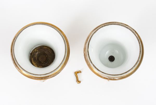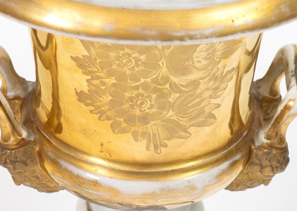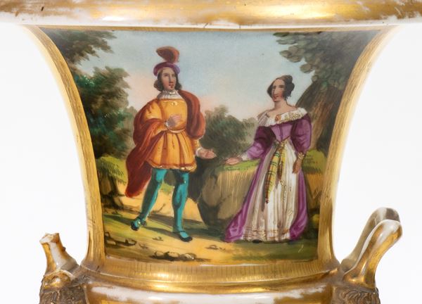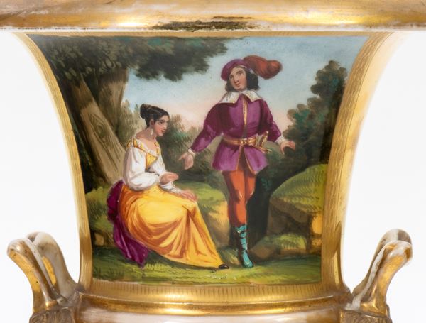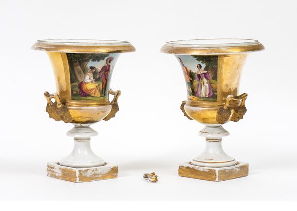 in white and gold porcelain, of the so-called Medici form, with a circular foot on a square plinth, decorated on the fronts with reserves containing polychromatically painted scenes; attachments on the side handles with male heads.
