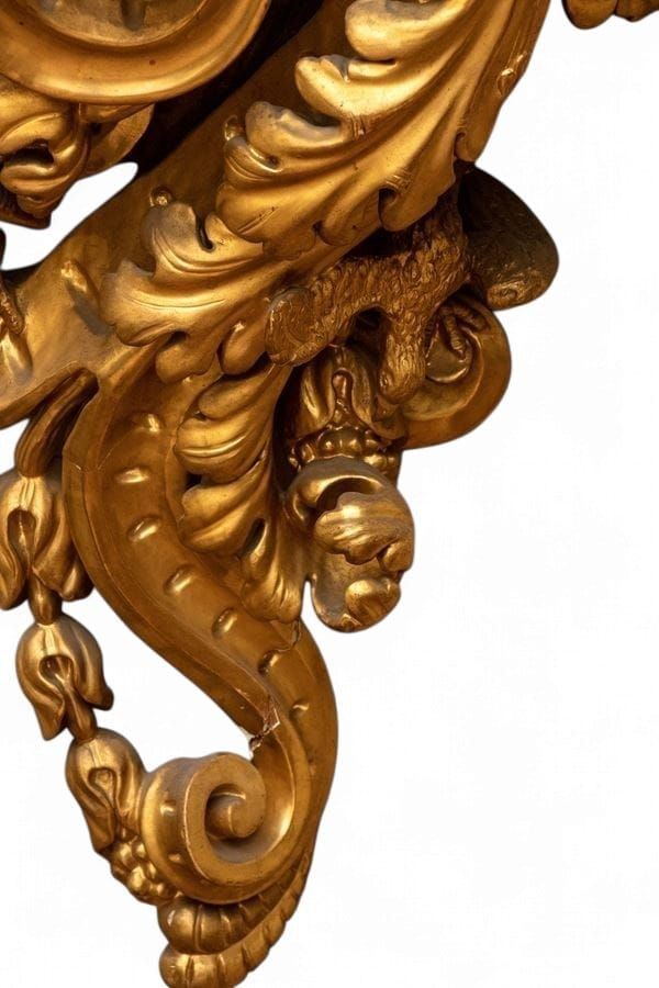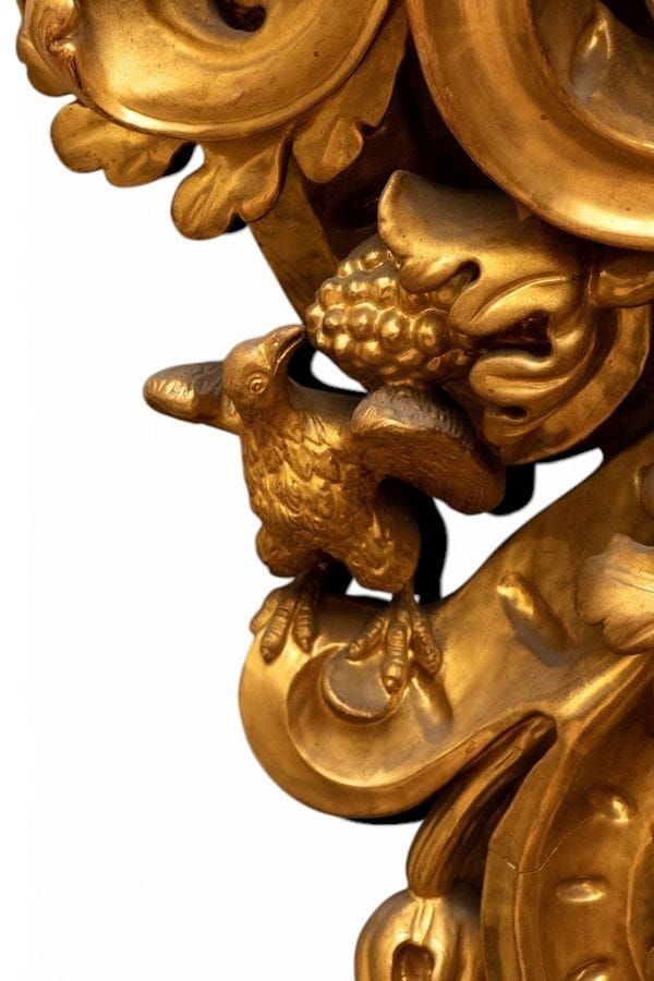 marble top, carved with volutes, plant forms and birds. Gilded in pure gold, city of Rome eighteenth century.