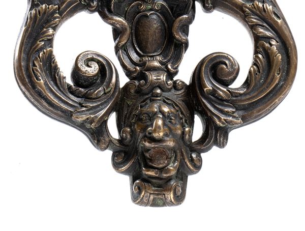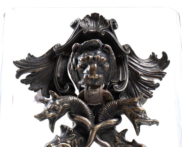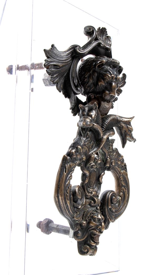 cast bronze decorated in fantastic motifs with lion heads, mythological creatures, and masks.