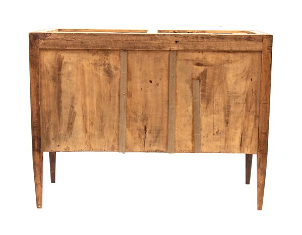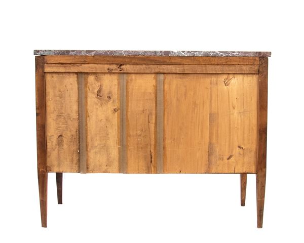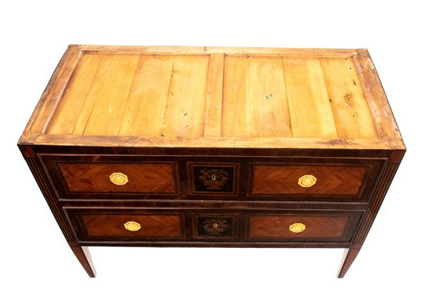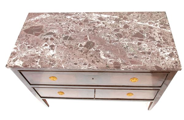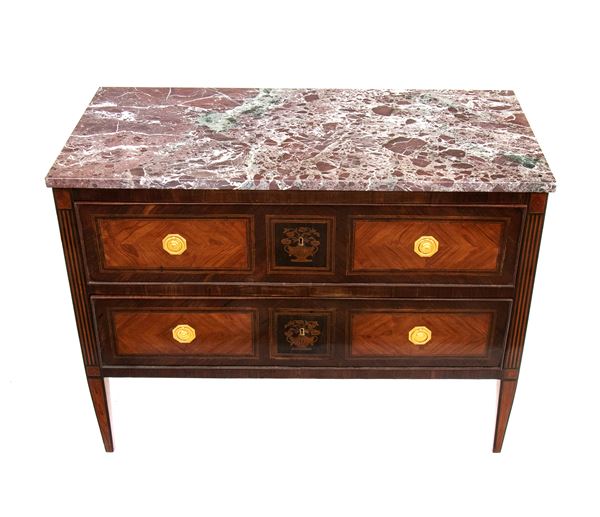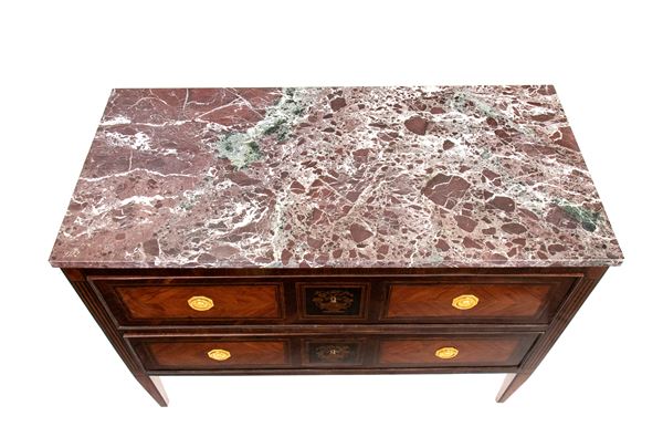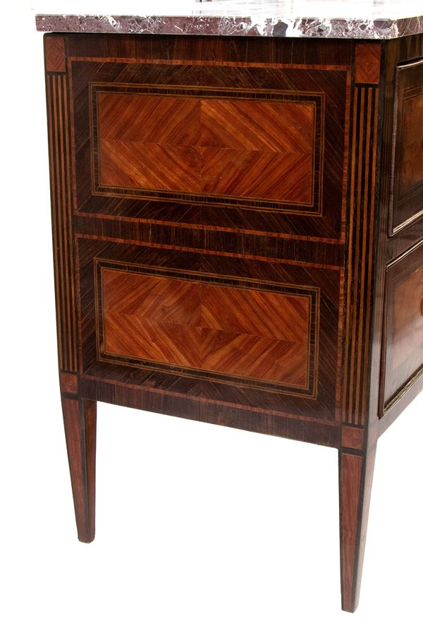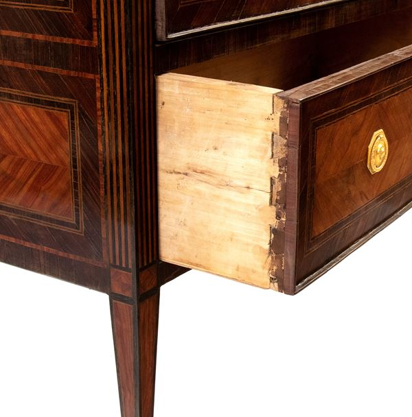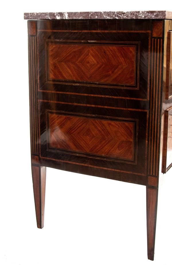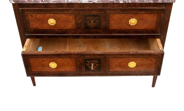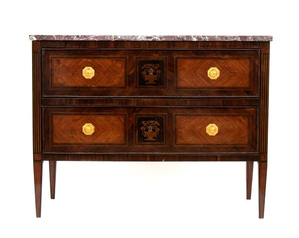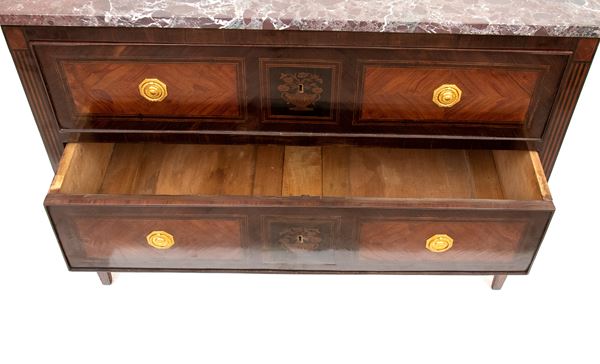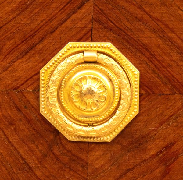 in ebony and rosewood (Dalbergia spp), inlaid in fruit woods with floral motifs in the central part of the drawers and geometric motifs on the rest of the surfaces. Marbles of later period