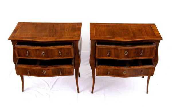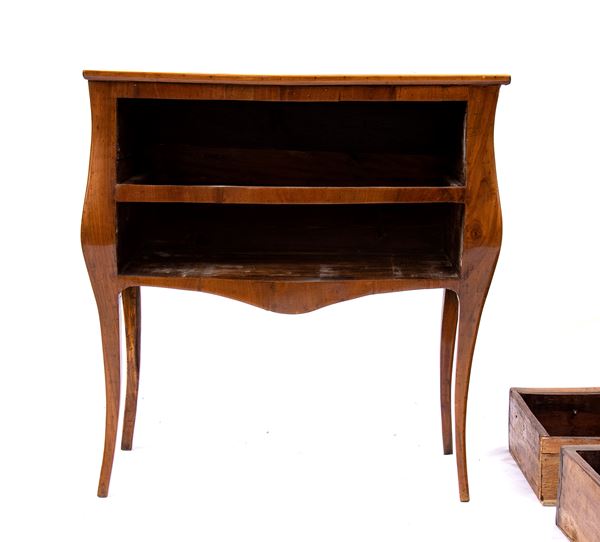 walnut with fruitwood inlays, two-drawer with wavy front and sides and cabriole legs.