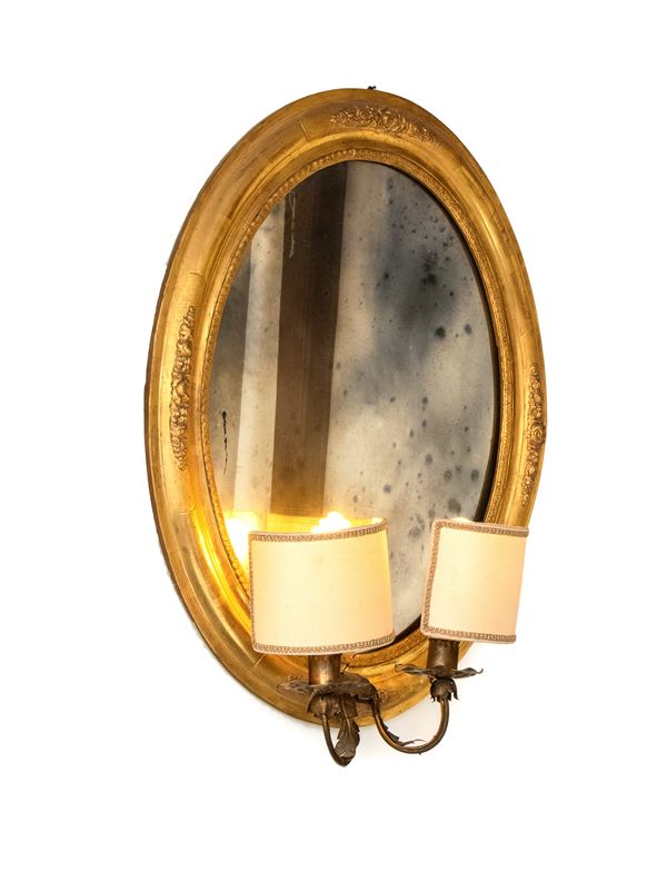 with floral decoration on the moulded frame, two bronze leaf arms with candle holder. Electrification from a later period.