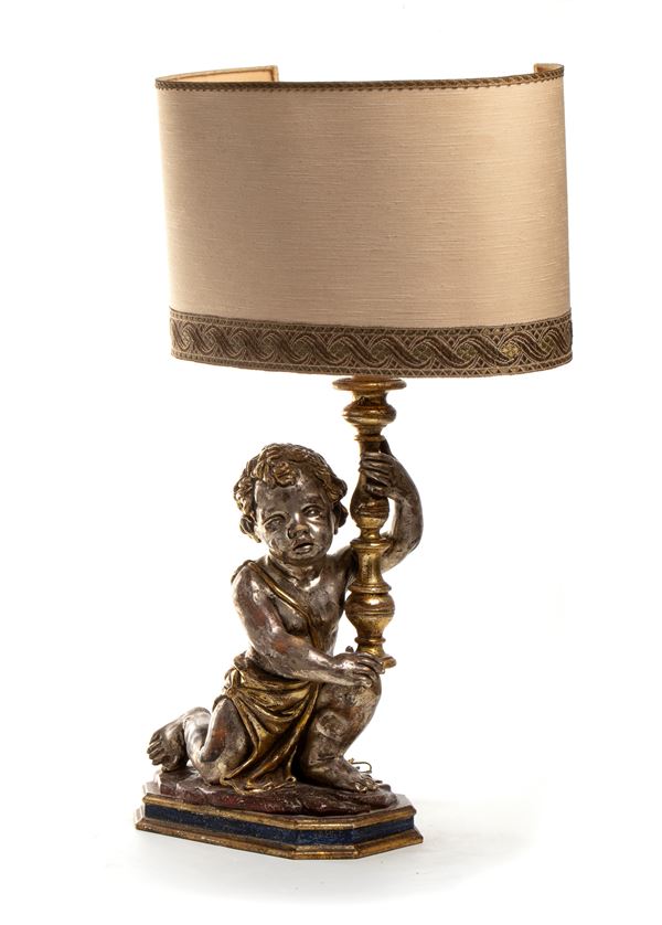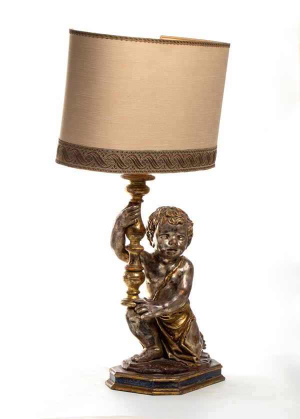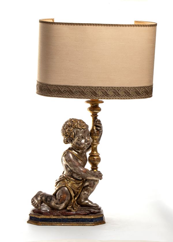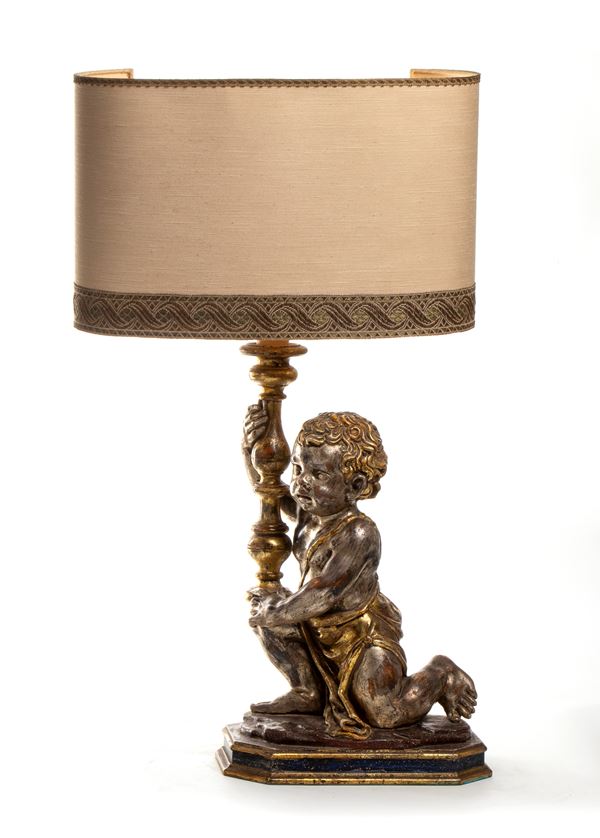 carved wood depicting two children holding a flashlight, mecha work. Provenance Northern Italy