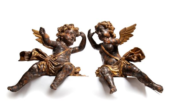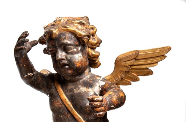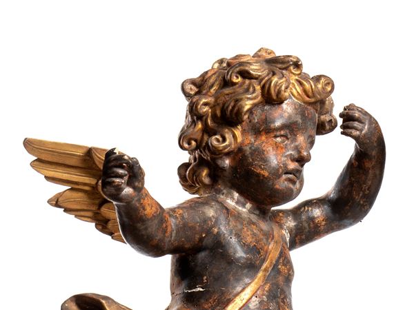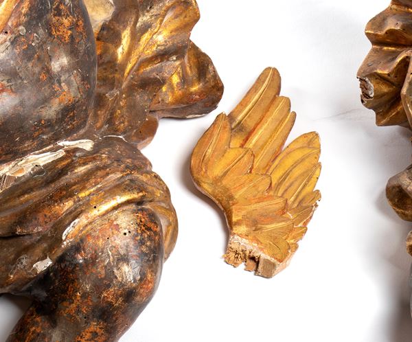 carved and gilded wood, depicting two winged putti in movement with great anatomical rendering. The finely detailed wings lend lightness and grace to the composition. The original gilding emphasises the Baroque character of the work, with the putti arranged on a base of sculpted clouds, also finely gilded.