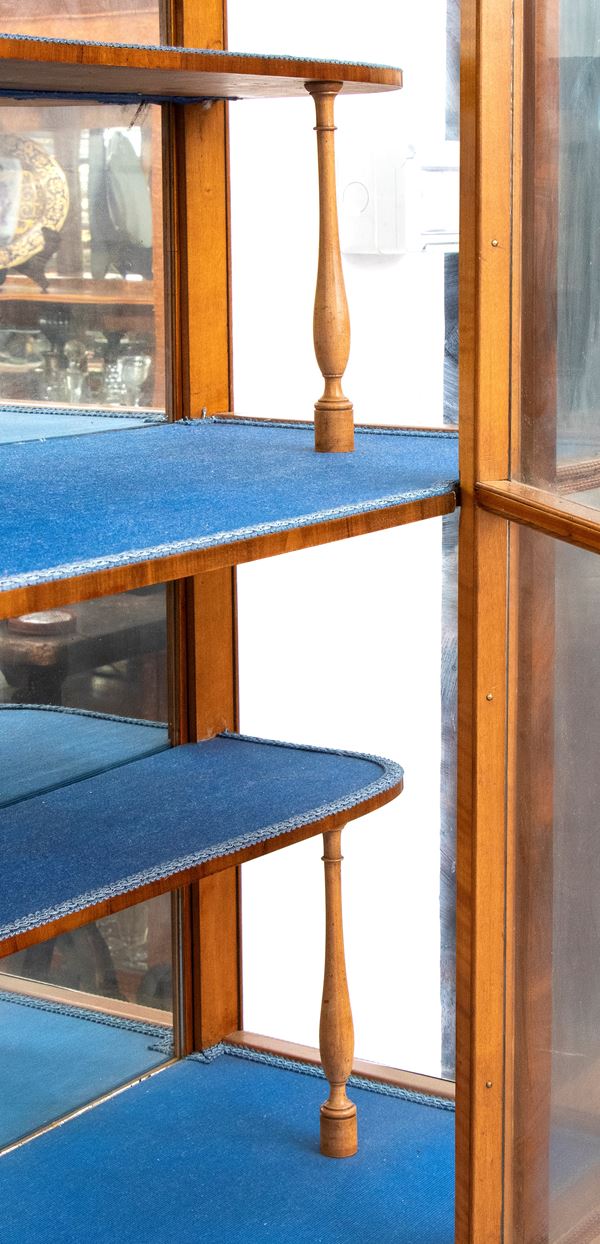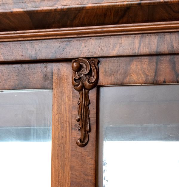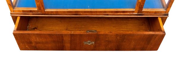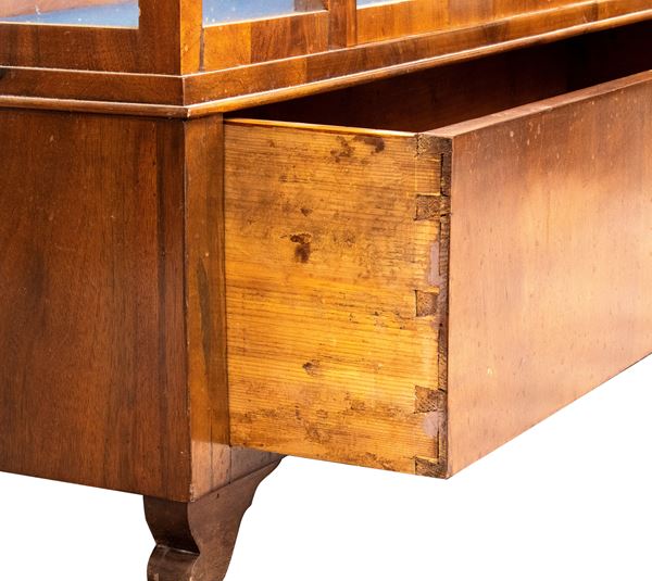 made of walnut burl, with maple interior and shelf supports, drawer in the lower base and base resting on four carved feet.