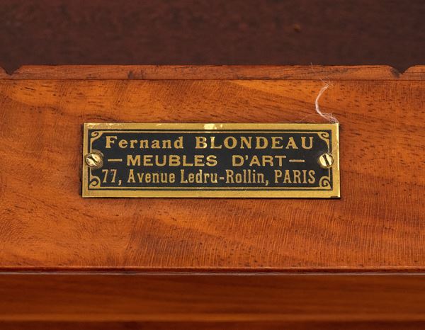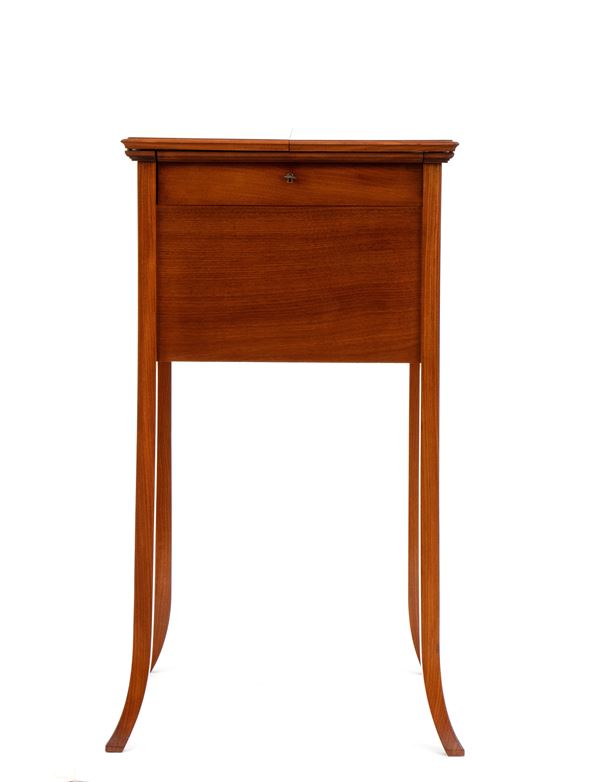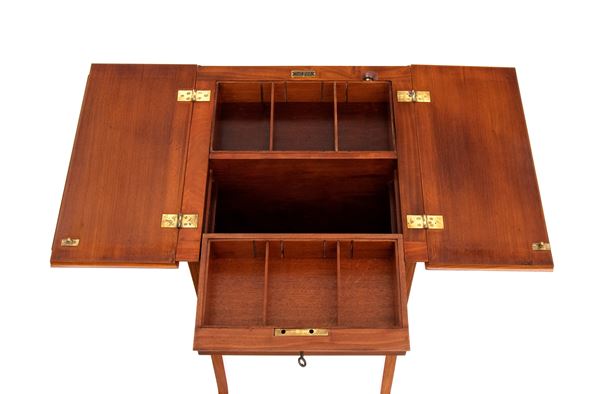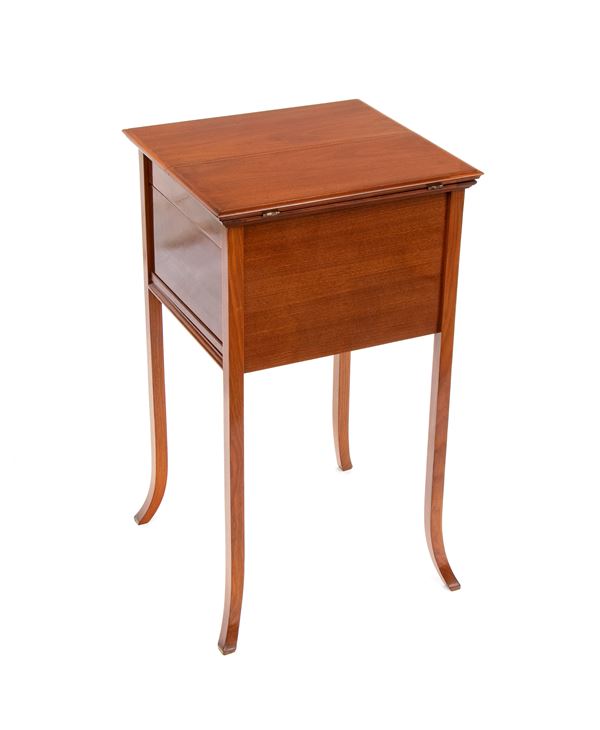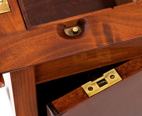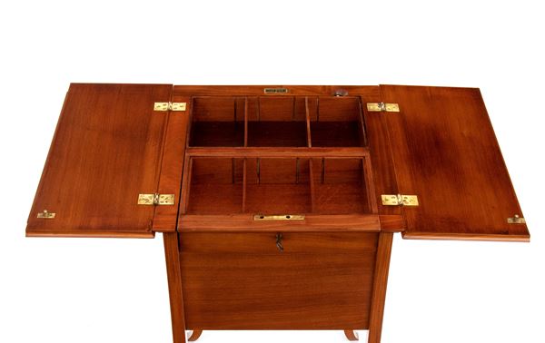 mahogany wood, with central drawer concealing compartment underneath, booklet top opening with cigarette-cigar holder and finally in the back rotating door with integrated pipe holder.